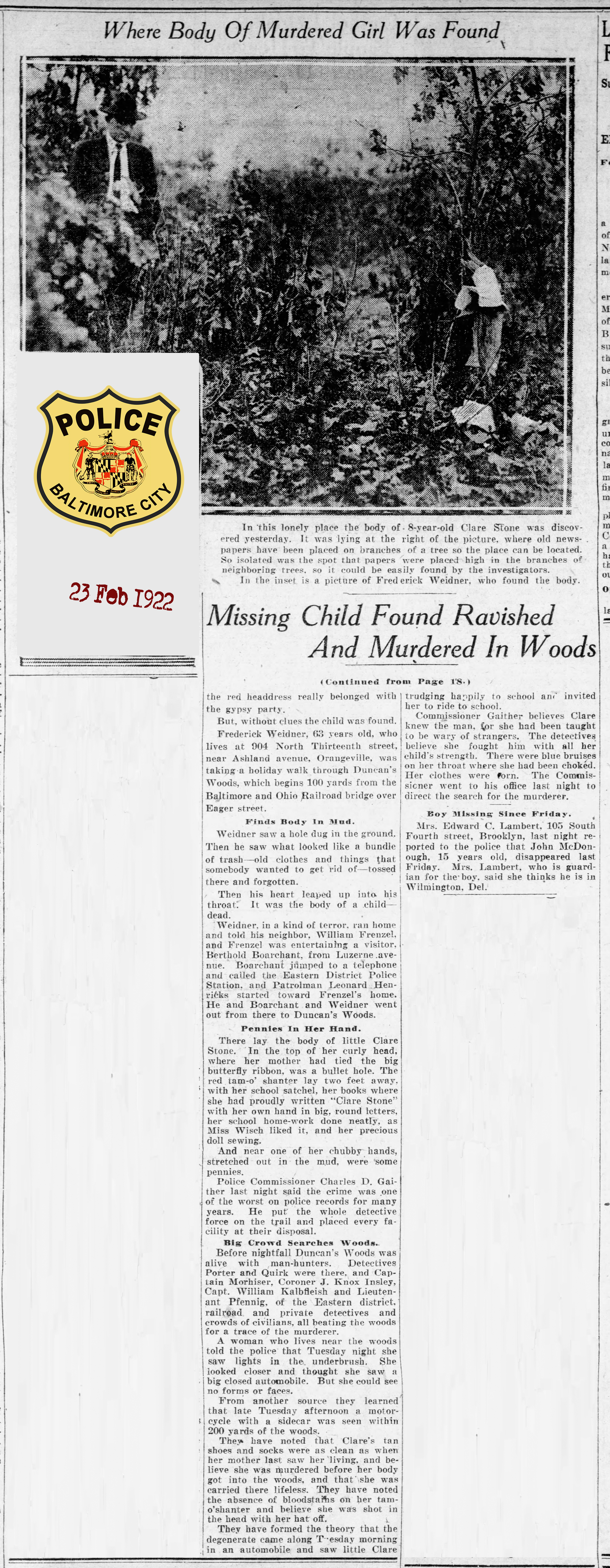 When 7 year old (or perhaps 8 year old) Myra Clare Stone (known by “Clare” or “Clara” Stone) was found dead on February 22, 1922, it caused a sensation in Baltimore.